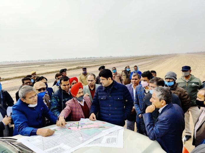 हवाई अड्डे के रनवे निर्माण कार्यों का निरीक्षण करने उपरांत उप-मुख्यमंत्री दुष्यंत चौटाला ने दी जानकारी