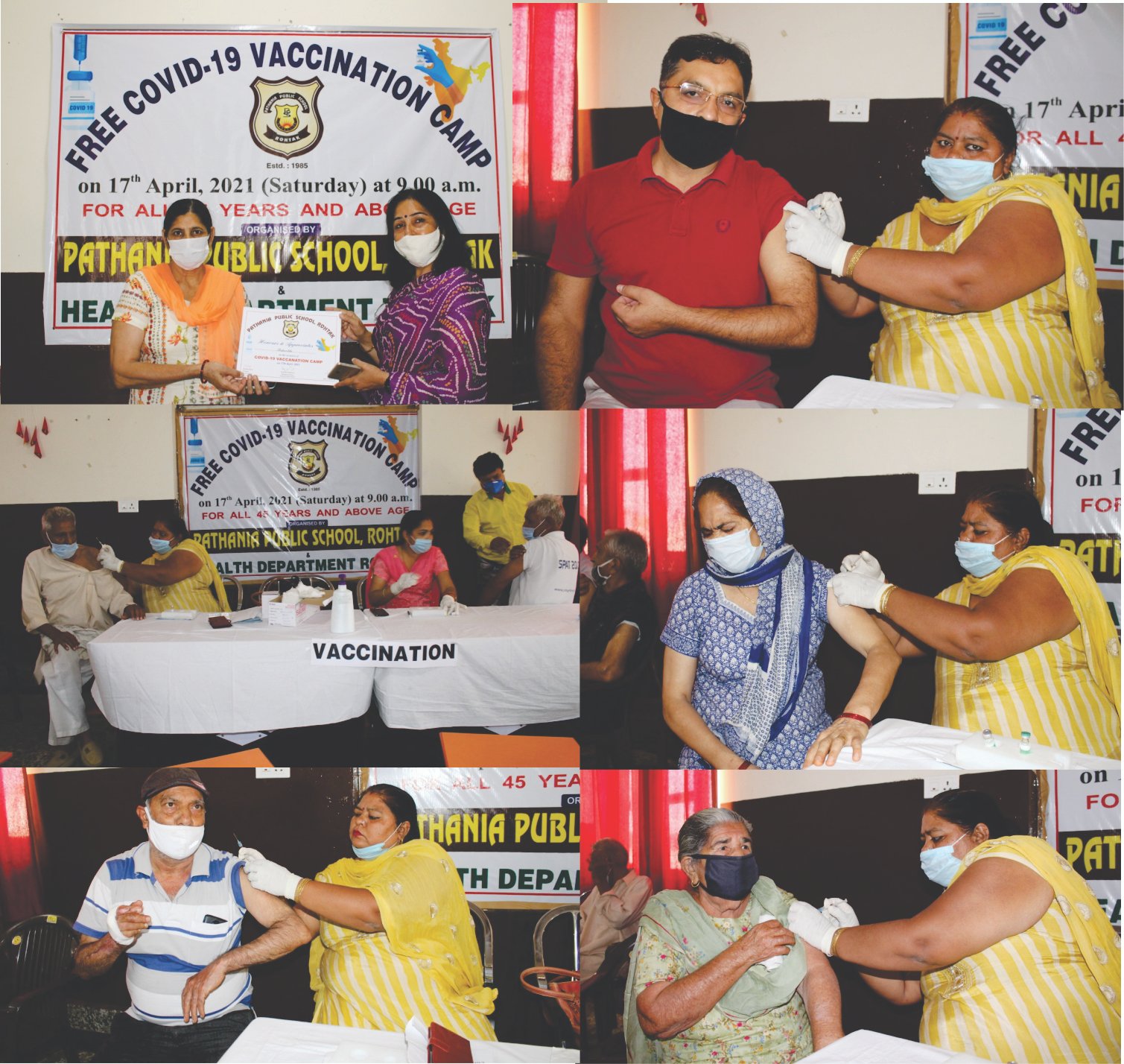 पठानिया वर्ल्ड कैंपस के प्रांगण में स्वास्थ्य विभाग रोहतक के सहयोग से निशुल्क कोविड-19 टीकाकरण कैंप का आयोजन किया गया। जिसमें 130 लोगों का को कोरोनावायरस से बचाव हेतु टीका लगाया गया। यह कार्यक्रम प्रातः 9:00 बजे से शाम 3:00 बजे तक चला। पंडित भगवत दयाल शर्मा हेल्थ यूनिवर्सिटी से आए ,डॉक्टर भंवर सिंह, डॉक्टर कविता रानी ,डॉक्टर सुनीता कुमारी ने बताया कि कोरोनावायरस एक कम्युनिटी स्प्रेड वायरस है और इसको रोकने के लिए यह टीकाकरण आवश्यक है। कोरोनावायरस को फैलने से रोकने के लिए भारत में बनी कोविड वैक्सीन बहुत ही विश्वसनीय वैक्सीन है और सभी देशवासियों को बिना किसी बहकावे में आए इसे अवश्य लगवाना चाहिए ताकि हमारा देश व पूरा विश्व इस वायरस से जल्द से जल्द छुटकारा पा सके ।इस कैंप का संचालन श्रीमती कोमल बुटन के निर्देशन में किया गया। इस अवसर पर स्कूल निर्देशक श्री अंशुल पठानिया ,प्रधानाचार्य श्रीमती वर्षा पठानिया , तन्वी पठानिया ,प्रशासक श्रीमान प्रियांक, उप प्रधानाचार्य श्रीमती सुनीता मोर, हेडमिस्ट्रेस श्रीमती सुमन राठी, कोर्डिनेटर श्रीमती लक्ष्मी त्यागी ने टीकाकरण हेतु कैंप में आने वालों का धन्यवाद किया और सभी से निवेदन किया कि वह “2 गज की दूरी मास्क है जरूरी”का अवश्य पालन करें।